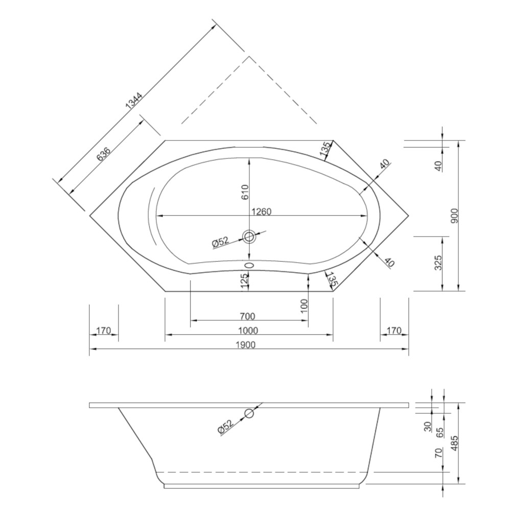 Herstellerangaben zum Produkt "6-Eck-Badewanne DENVER 190x90 cm - extratief mit 49 cm"