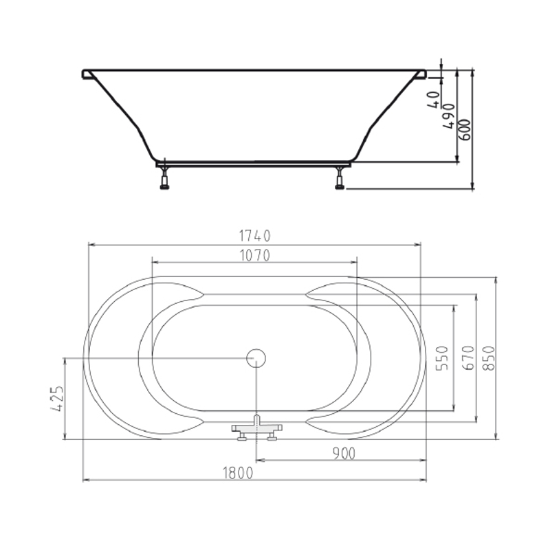 Ovalwanne als Zweisitzerbadewanne in dem Maß 180x85 cm.